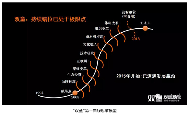 上述思維模型是“雙童”從1994年起步,但在2005年遭遇了發(fā)展瓶頸,雖然通過(guò)后續(xù)各個(gè)時(shí)期的錯(cuò)位競(jìng)爭(zhēng),不斷創(chuàng)新一步步堅(jiān)持到現(xiàn)在,但是“雙童”的今天已是持續(xù)錯(cuò)位到了極限點(diǎn)的狀態(tài),已經(jīng)遇到天花板。