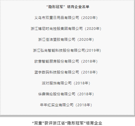 日前,浙江省經(jīng)濟和信息化廳公布2020年浙江省“隱形冠軍”企業(yè)和“隱形冠軍”培育企業(yè)的名單。“雙童”獲評省“隱形冠軍”培育企業(yè)!