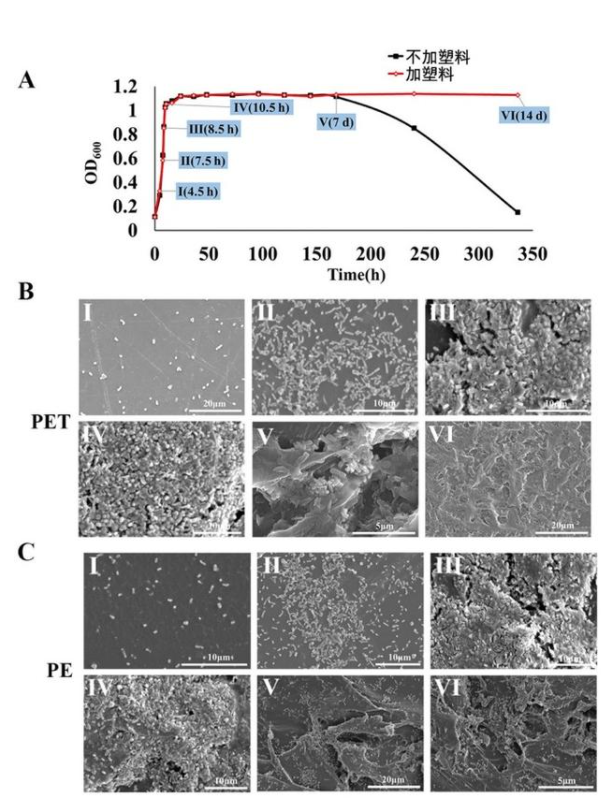 2016年,日本京都工藝纖維大學的小田康平和慶應義塾大學的宮本賢治領導的研究小組發現,一種微生物可以吞食對苯二甲酸酯塑料(PET),這種攝食PET的細菌稱為大阪堺菌。今年一月,《美國化學會·催化》雜志發表了中國科學院微生物研究所的吳邊團隊進行的研究,對大阪堺菌降解PET塑料所需的酶進行優化,獲得了穩定性顯著增強的重設計酶,使得大阪堺菌對PET薄膜的降解效率提升了300倍。