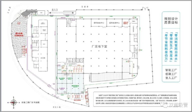 2020年年初,“雙童”二期新廠房投入使用,廢水收集中水回用系統在原來“雙童”一期廠房的基礎上進行了大量的優化和提升,讓員工日常生活中所產生的廢水不僅得到循環利用,而且還消滅了企業的廢水排放和污染,同時還為企業節省了大量水費支出! “雙童”二期新廠區:廢水收集中水處理原理圖 “雙童”二期新廠區節能降耗設計圖