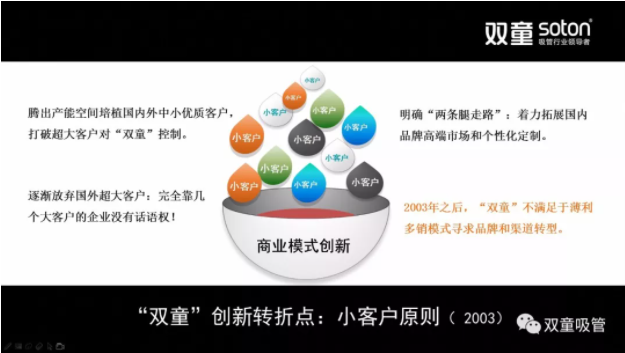 “雙童”的“兩條腿走路”戰略,既保留了一部分有合理利潤的長期訂單,又開拓了個性化、精細化的小客戶,大幅提升了客戶數量,拓寬了產品經營廣度,經營風險大大下降,從而掌握了企業的經營主動權,促進了企業的研發創新能力,帶動了“雙童”品牌的不斷提升。