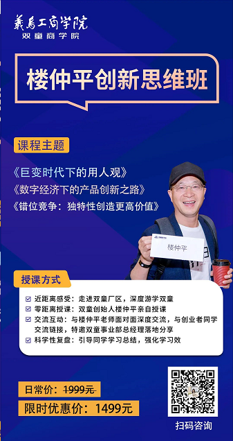 2021年,“義烏工商學(xué)院-雙童商學(xué)院”正式成立,打造義烏創(chuàng)業(yè)者“家門口的商學(xué)院”。“雙童”創(chuàng)始人樓仲平將40多年的創(chuàng)業(yè)實踐經(jīng)驗和30多年的商業(yè)理論相結(jié)合,將曾在北大、浙大等大學(xué)分享的MBA商業(yè)實戰(zhàn)課程帶回義烏,聚焦本土中小創(chuàng)業(yè)者發(fā)展痛點,打造 樓仲平創(chuàng)新思維班 ,并獲得了三千多名學(xué)員的一致好評!