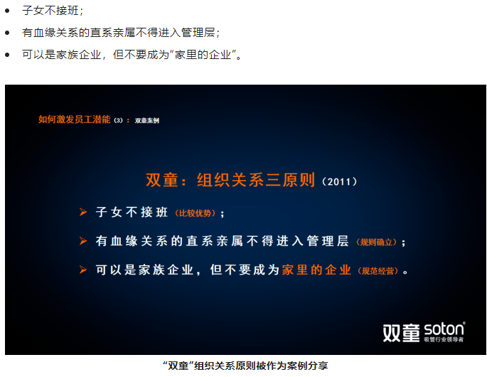 在這樣的過程中,“雙童”解決了“二代傳承”問題,也為完成組織變革打好基礎,推動“反熵增”破界,破除僵化的邊界,給經理人團隊釋放活力和信號,激發大家看到可預期的成長空間,繼而獲得彼此的“信任和信心”!