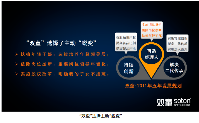 2010年前后,“雙童”大部分管理層由于年齡偏大,逐漸難以適應數字化環境帶來的挑戰,管理上創新不足,奮斗意識開始持續下降,“雙童”因此選擇主動“蛻變”,調整管理人員結構,并在組織關系原則中明確有血緣關系的直系親屬不得進入管理層,作為巨變時代下的自救手段。