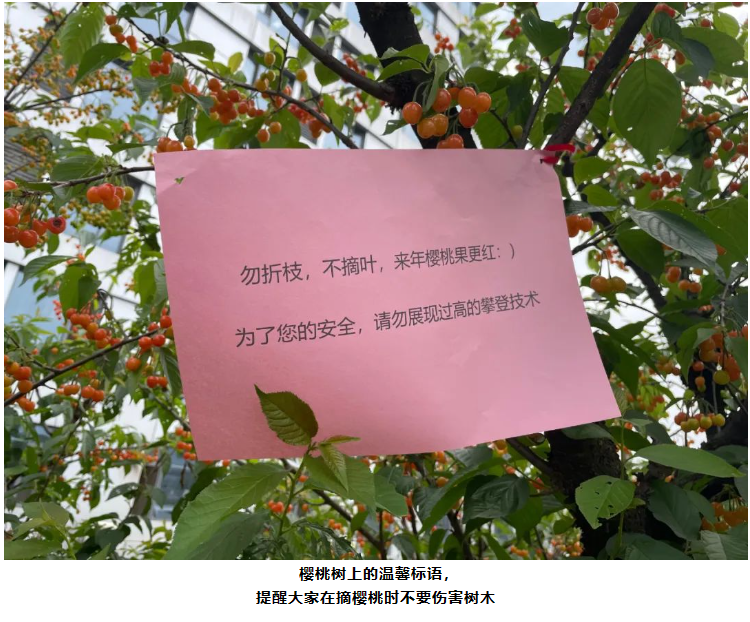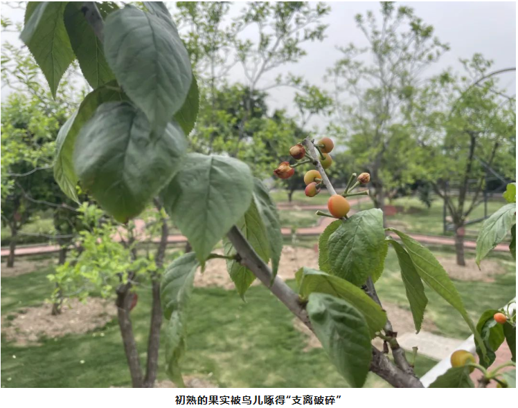 吸管妞可是眼看著這些櫻桃由青轉黃,由黃轉橙,最后變成紅色的呢!由于光照條件不同的關系,現在不少果實還是橙色的。只是沒想到,由于櫻桃太過于可口,不少鳥兒都爭先啄食。為了讓更多果實留存下來,讓員工和遠道而來的客人們可以品嘗到新鮮美味的櫻桃,園丁叔叔給還未完全成熟的櫻桃樹裹上了紗網。