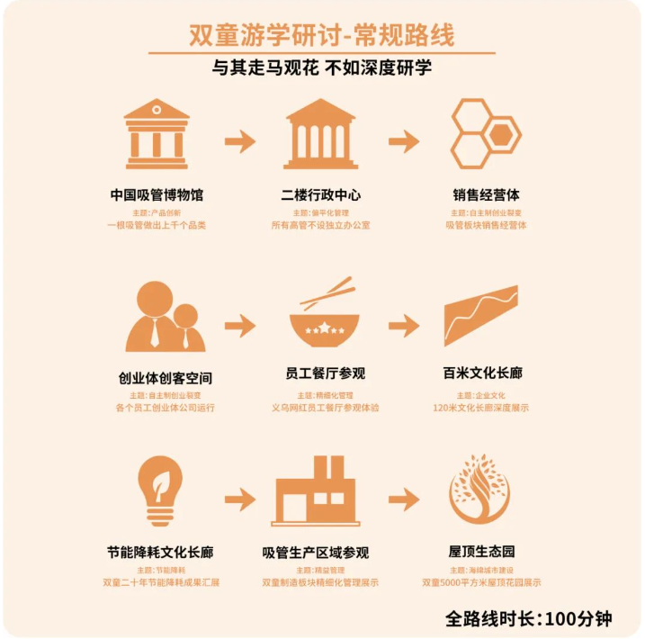 此外,我們還會帶領(lǐng)大家現(xiàn)場參觀 全球首家吸管博物館, “雙童”清潔無塵車間, 每年省下300多萬的節(jié)能降耗系統(tǒng), 集雙童故事、文化、經(jīng)營理念等于一身的文化長廊, 還有5000㎡的空中生態(tài)園! 更可現(xiàn)場觀摩“雙童”獨特的內(nèi)部創(chuàng)業(yè)模式, 與各創(chuàng)業(yè)體負(fù)責(zé)人互動交流, 探尋“雙童”獨特的文化魅力!