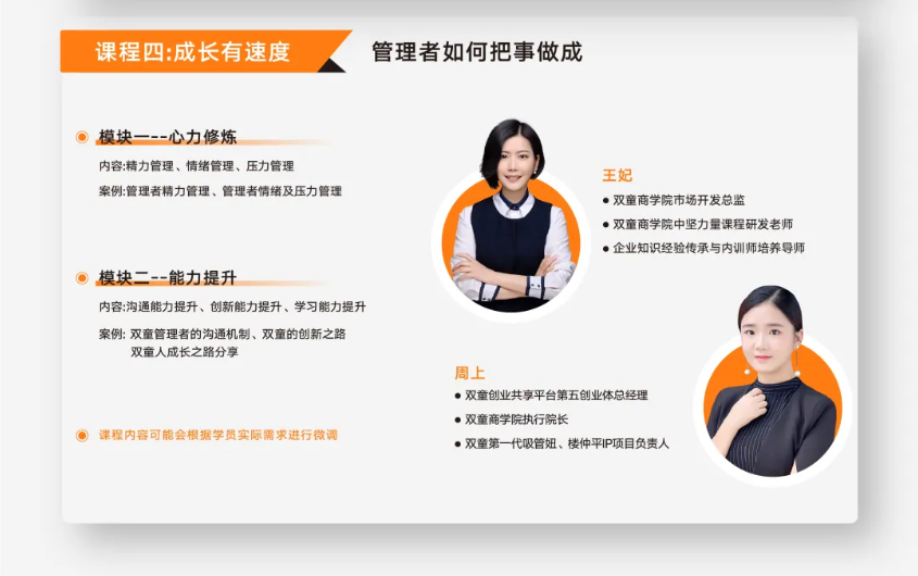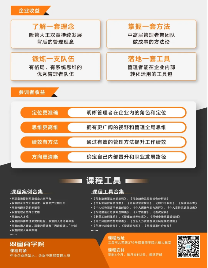該課程學制為4個月,每月交付2天完成一個課程主題學習,循環開班。為了不耽誤企業正常運轉,更好安排中層管理集中學習,開課時間一般會安排在周六日。