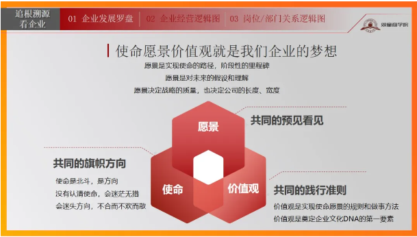 “追根溯源看企業(yè)”旨在讓參訓(xùn)學(xué)員明確自己企業(yè)發(fā)展目標(biāo)、夢想,并推動目標(biāo)的實(shí)現(xiàn);正確認(rèn)知企業(yè)經(jīng)營現(xiàn)狀,明確企業(yè)盈利的關(guān)鍵點(diǎn)和卡點(diǎn);掌握科學(xué)合理地劃分部門與崗位的依據(jù)和方法。