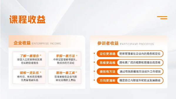 《中堅(jiān)力量》全課程按照思維有高度、帶人有溫度、做事有力度、成長有速度四個主題分期交付,秉著實(shí)用主義的原則,各位老師在課程交付中,不僅拆解原理,還直接給工具、給方法,以幫助參訓(xùn)企業(yè)全方位的提供管理者綜合素養(yǎng)!