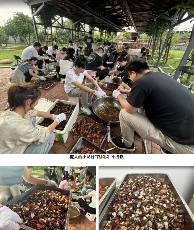 等到300斤小龍蝦被運(yùn)到空中花園時(shí),所有的小伙伴都已經(jīng)準(zhǔn)備就緒了,有專門去頭取蝦線的小分隊(duì),小龍蝦“洗刷刷”小分隊(duì)、傳送小分隊(duì)和后廚配菜、掌勺小分隊(duì),大家分工明確,同步進(jìn)行,配合相當(dāng)完美,就像平時(shí)在工作中一樣有默契,每一個(gè)步驟都不假人手,親自完成,滿滿參與感!