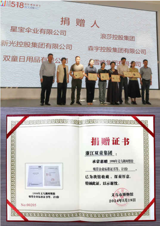 “雙童”作為義烏市場發展的參與者與見證者,由雙童第五創業體總經理周上代表公司為新館“添磚加瓦”,捐贈兩項標準原件,即:1998年,首件吸管行業企業標準;2009年,金華市首件國家標準-《聚丙烯飲用吸管》國家標準。這兩件標準,也代表了義烏的中小企業在發展過程中對標準化、規范化的追求!