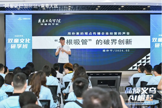 “雙童”創始人樓仲平也為前來研學的商家們分享《“一根吸管”的破界創新》,講述了與阿里結緣20多年的故事,并深度剖析了“雙童”作為一家中小企業,如何做到與數字化深度融合,并能轉型成功的。