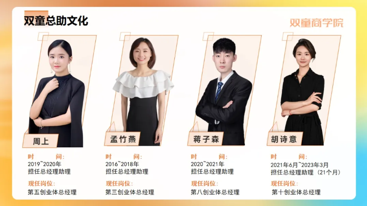 憑借一己之力成為雙童招聘“半壁江山”的蘇紀林、從基層一線員工成為總經理的李二橋、從內勤崗位成長為經營體體長的關萌萌、在助理文化下完成創業夢想的多位總經理……類似的案例,在“雙童”不勝枚舉!