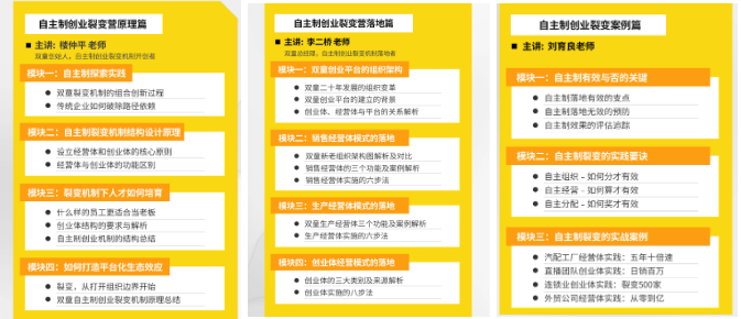 理論是實踐的基礎,先弄清楚機制的運行原理,才能談得上有效實踐!所以在課程交付過程中,講師樓仲平會花費一整天的時間,將課程干貨分為四大模塊,共11小節,為學員深度解析自主制創業裂變的機制原理!