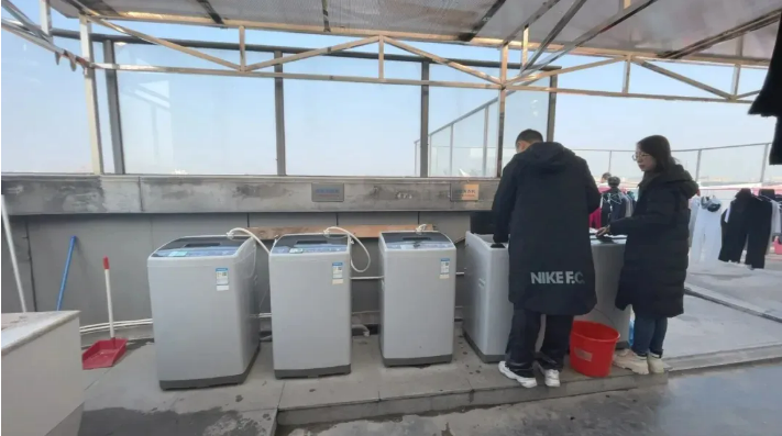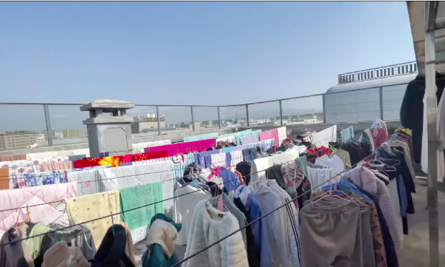 在員工宿舍9樓,“雙童”設(shè)有一個露天洗衣房,這個區(qū)域大約有兩三百平方米。為了應(yīng)對多變的天氣條件,該區(qū)域上方安裝了陽光板。這樣做的原因是為了在晴天時讓陽光充分照射進來,使衣物能夠得到充足的日曬,同時在雨天又能防止衣物被淋濕。