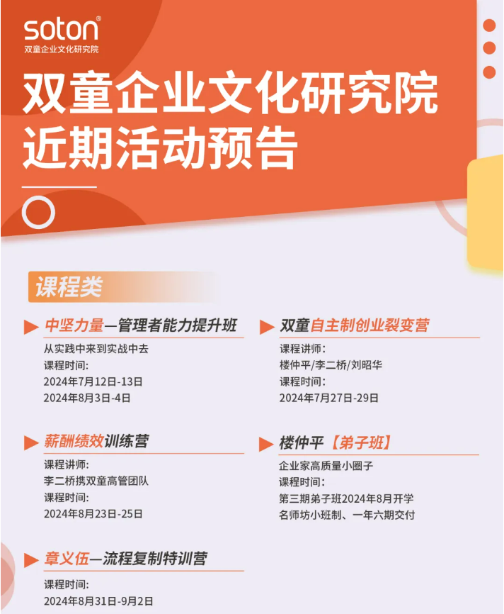 如果你也對“雙童”如何通過精細化管理引領(lǐng)新風尚充滿好奇,渴望為你的團隊注入成長的新動力,歡迎走進7月18日【雙童文化研學班】,與上百位優(yōu)秀的創(chuàng)業(yè)者一起學習!少量名額,歡迎咨詢鎖定!