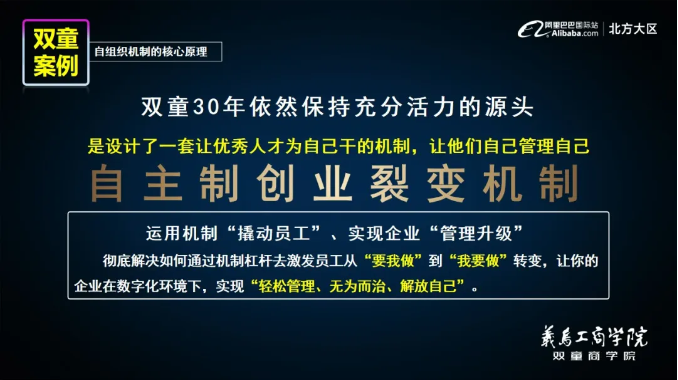 烏卡時代下,樓仲平意識到數(shù)字化只是一種技術、一個工具,最終是服務于人的。它為員工提供工作便利的同時,也讓傳統(tǒng)雇傭關系面臨瓦解。面對數(shù)字化挑戰(zhàn),“雙童”決定結合多種組織機制和中小企業(yè)的特點,自制了一套適用于中小企業(yè)的組織創(chuàng)新制度——自主制創(chuàng)業(yè)裂變機制,讓員工從“要我做”到“我要做”轉(zhuǎn)變。