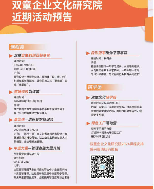 如果你也對“雙童”充滿好奇,也想改變企業困局現狀,也想要學習“專精特新”企業的管理經營方法,歡迎咨詢報名“雙童”課程!