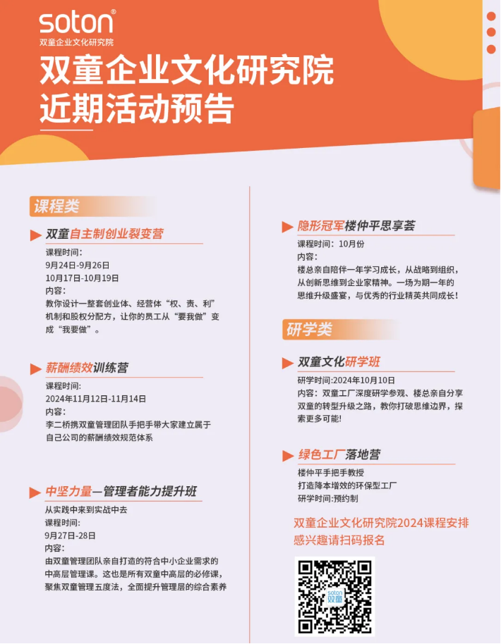 如果你也對“雙童”充滿好奇,也想賦能團隊共同成長,歡迎走進10月10日【雙童文化研學班】,與上百位優秀的創業者一起學習!少量名額,歡迎咨詢鎖定!同時,熱忱歡迎各大商會、協會及企業提前單獨成團預約哦~