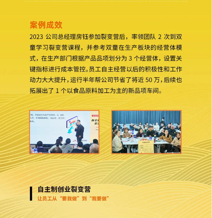 而《自主制創業裂變營》就是依托該機制,把“雙童”的落地實操方法與成功經驗經驗有機結合,不斷打磨、升級的一套針對中小微企業的管理課程。