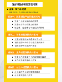 落地實操篇則由雙童總經理李二橋進行交付!作為裂變機制的執行者,他以雙童內部對裂變機制的實際運行狀況為案例教材,將課程分為五大模塊,16個小節,盡可能最詳細、最全面地交付給學員操作方法!