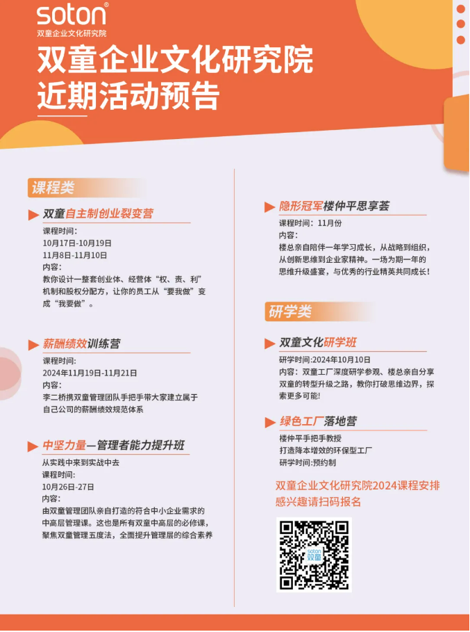 雙童走過的三十載春秋,是歷經風雨洗禮、勇往直前的三十年,也是攜手各界伙伴共同成長的三十年。這三十年的輝煌成就,深深植根于每一位員工的辛勤付出,得益于每一位客戶的信賴與扶持,更離不開近年來眾多商學院學員的并肩同行!