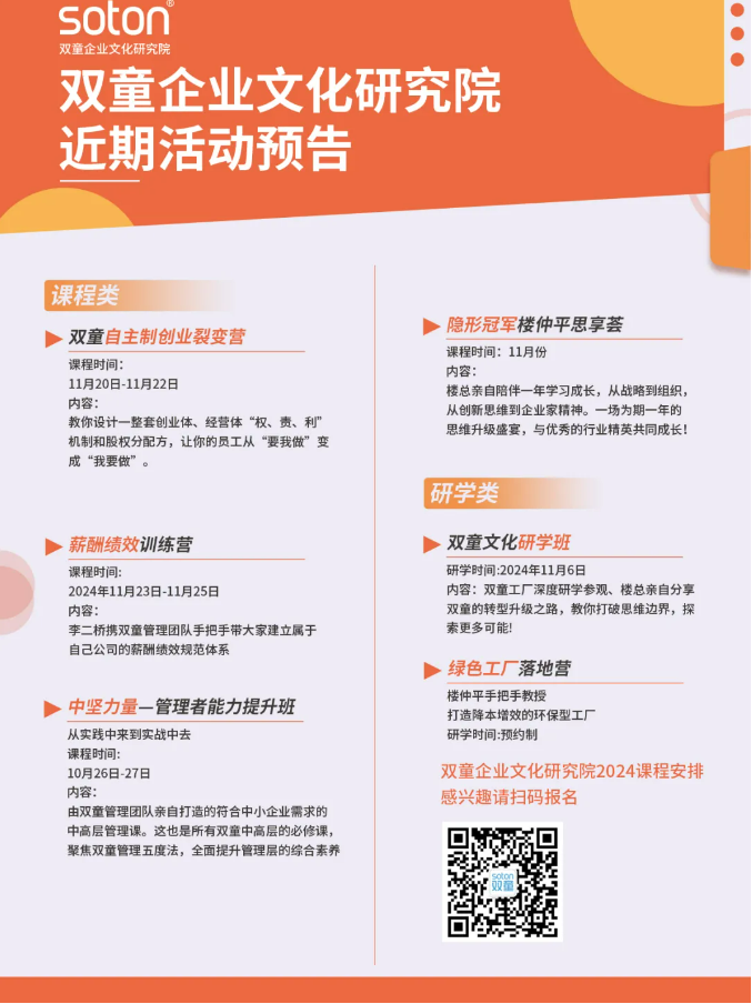 隨著“雙童”案例的廣泛傳播,自主制創業裂變機制也逐漸被越來越多研究者調研。為了造福更廣大的中小企業,雙童商學院精心打造的自主制裂變營課程,目前已經發展得相當成熟,具備可復制性和可實踐性,完全契合中小微創業者的需求。