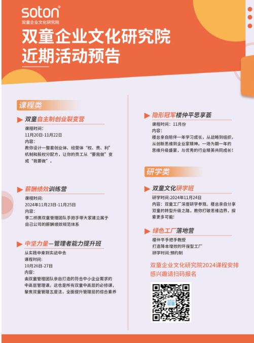 如果你也對(duì)“雙童”充滿好奇,也想讓企業(yè)成為行業(yè)的領(lǐng)導(dǎo)者,歡迎走進(jìn)11月24日【雙童文化研學(xué)班】,與上百位優(yōu)秀的創(chuàng)業(yè)者一起學(xué)習(xí)!少量名額,歡迎咨詢鎖定!