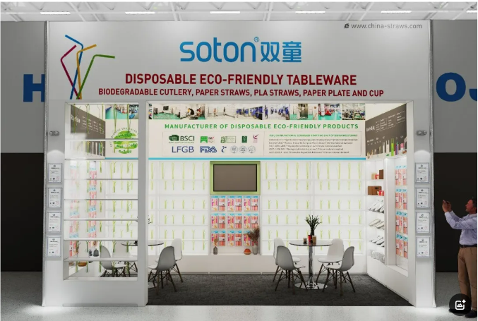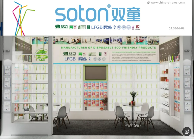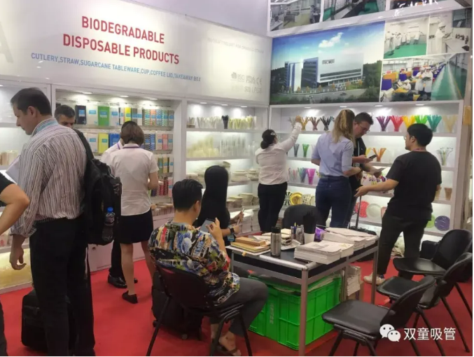 雙童日用品本次參展以推廣可降解產(chǎn)品為主:PLA吸管、紙吸管、可降解膜袋類、創(chuàng)新吸管、塑料口杯、PE手套、垃圾袋、塑料吸管、不銹鋼吸管、玻璃吸管、竹子吸管等。