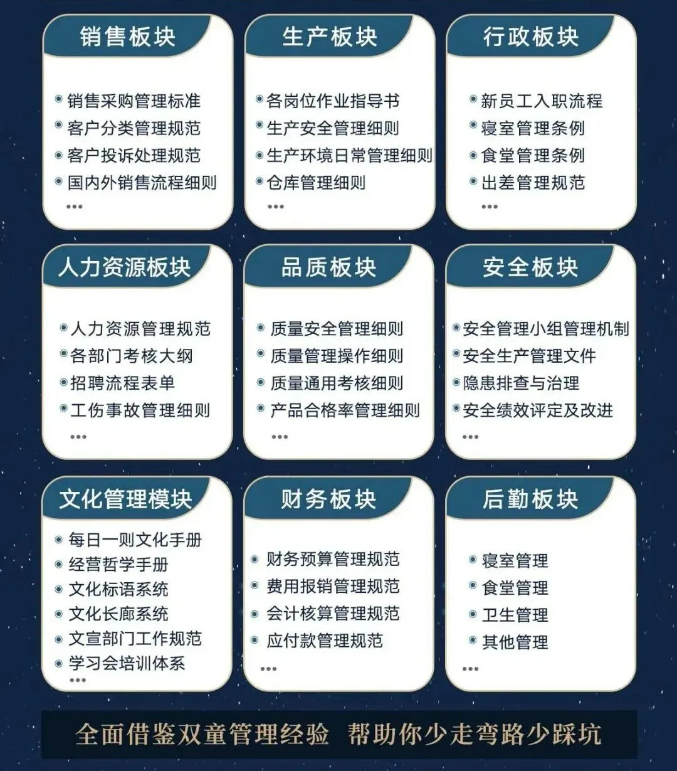 所以,入學“隱形冠軍樓仲平思享薈”之后,項目組會將“雙童”積累了30年、包含了銷售、生產、行政、人類資源、品質、安全、文化管理、財務和后勤等9大板塊,近600份管理規范文件,全部打包給學員,幫助學員企業能夠全面借鑒雙童管理經驗、少走彎路、少踩坑!