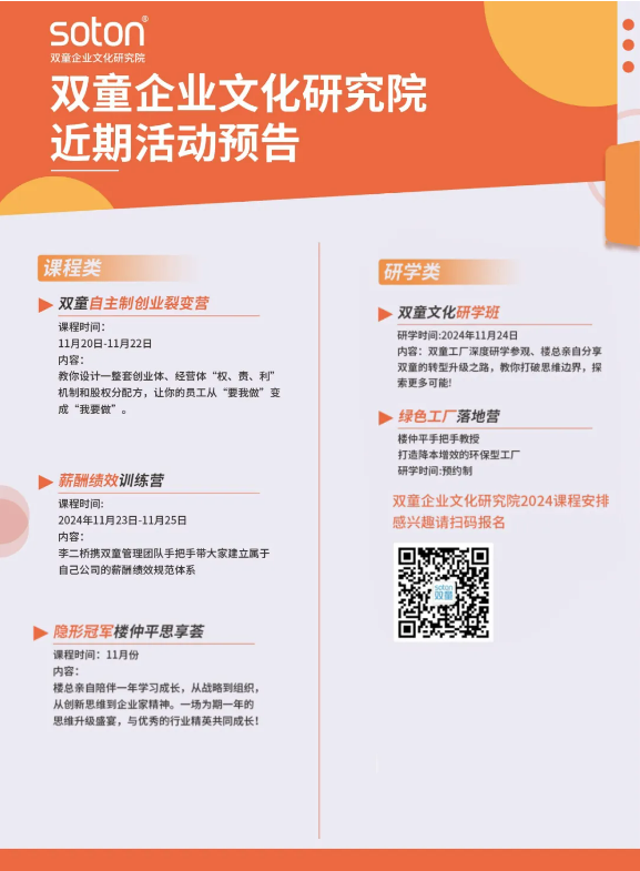 如果你也對“雙童”充滿好奇,也想賦能團隊共同成長,歡迎走進11月24日【雙童文化研學班】,與上百位優秀的創業者一起學習!少量名額,歡迎咨詢鎖定!