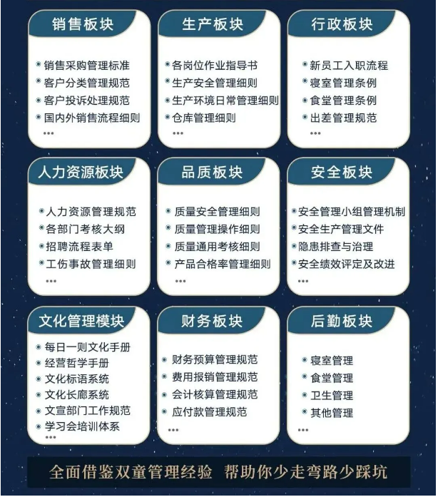 所以,入學“隱形冠軍樓仲平思享薈”之后,項目組會將“雙童”積累了30年、包含了銷售、生產、行政、人類資源、品質、安全、文化管理、財務和后勤等9大板塊,近600份管理規范文件,全部打包給學員,幫助學員企業能夠全面借鑒雙童管理經驗、少走彎路、少踩坑!
