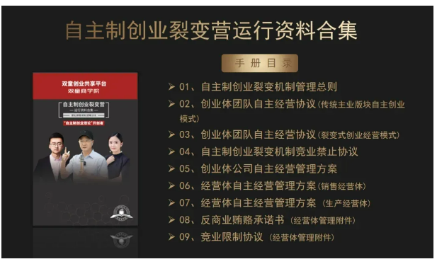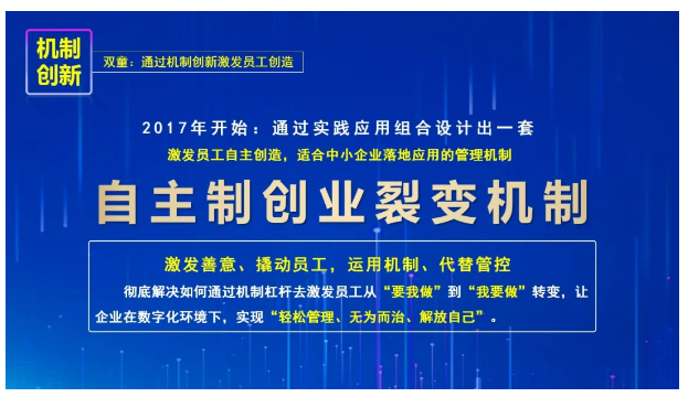 于是他果斷選擇破界創新,尋求企業發展的“第二曲線”,并結合多種組織機制和中小企業的特點,自制了一套適用于中小企業的組織創新制度——自主制創業裂變機制,搭建創業共享平臺,激發員工從“要我做”到“我要做”。