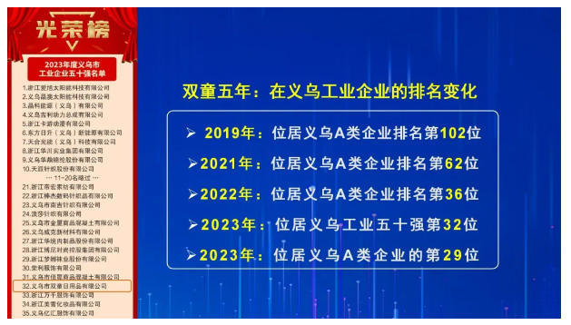 在自主制創業裂變的加持下,“雙童”在三年疫情期間,也實現了2.6倍的增長,從2018年到2023年,5年時間,更是再造了3.5個“雙童”,成功入圍“義烏工業企業五十強”!