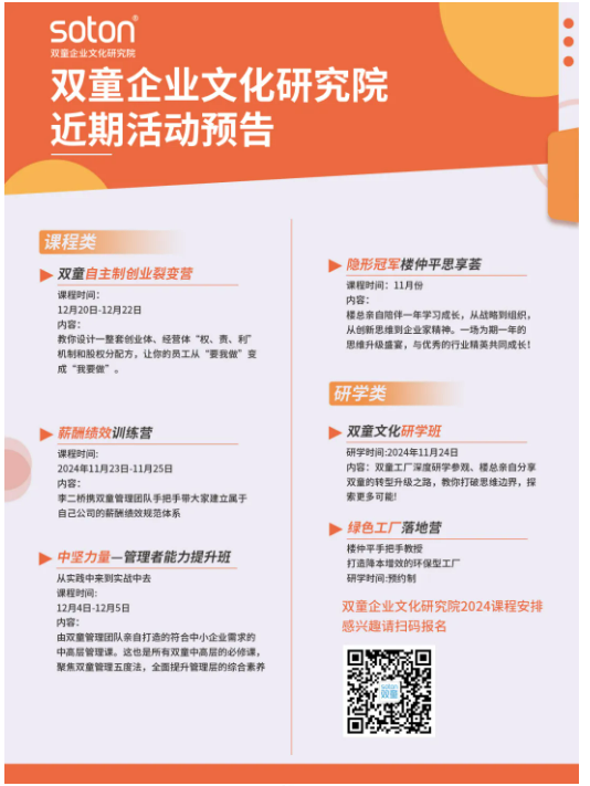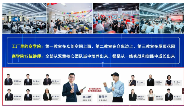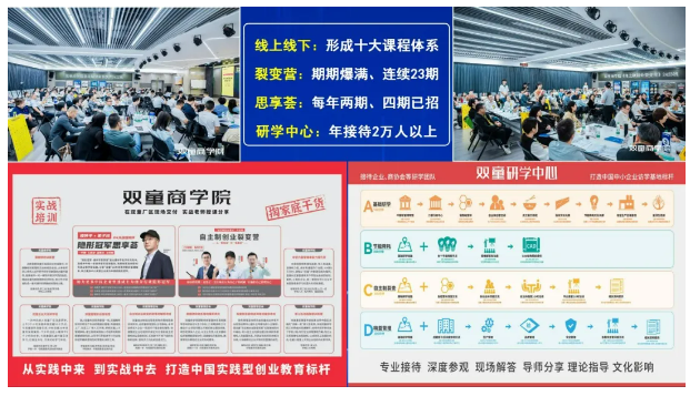 相較于傳統教培行業,雙童商學院的課程設計更加注重與實際一線工作的緊密聯系。它鼓勵學員親身體驗企業環境、深入創業社群、貼近員工工作日常、并沉浸于實踐操作的每一個環節。可以說,雙童商學院其實是工廠里的商學院,它開創了中國真正“實戰類”教培的新模式。