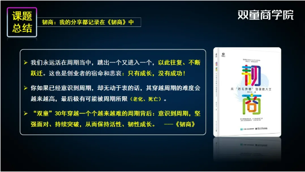 在整場主題分享中,樓總希望通過對自己和雙童成長周期的案例進行歸納、不斷探索和分析,能夠幫助現場的創業者們在雙童身上找到中小民營企業的共性,理解周期規律、突破心智、開門破圈,也希望能影響他們對企業經營保持敬畏,轉變認知,從而帶領自己的企業突破周期,韌性成長。