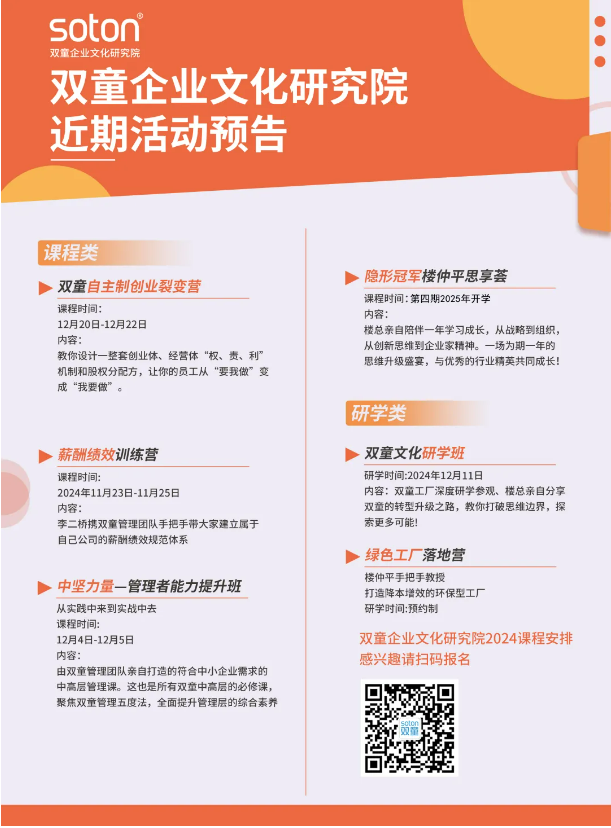 企業成長的背后是創業者的持續成長。所以,雙童這家企業能夠成功穿越周期的前提,是創始人樓仲平個人的持續成長、自我進化!