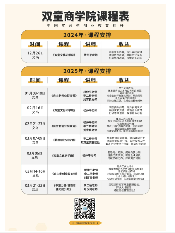 第2425期《自主制創(chuàng)業(yè)裂變營》計劃作為春節(jié)前的收官課程,但很多未報上名的學(xué)員表示,非常希望能在2025年伊始就為自己企業(yè)搭建一個可持續(xù)的激勵機制,以全新的面貌帶領(lǐng)團隊發(fā)展,所以在學(xué)員們的學(xué)習(xí)熱情下,雙童商學(xué)院特意增設(shè)了1月8號的《自主制創(chuàng)業(yè)裂變營》!