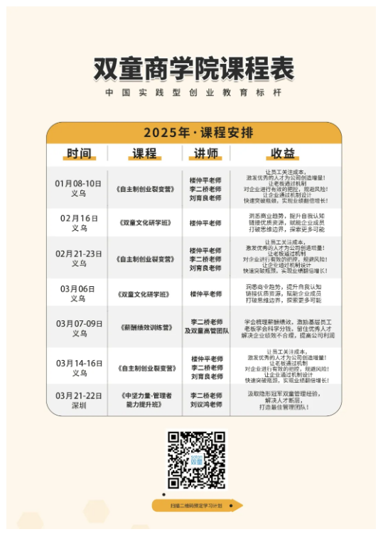 除了現(xiàn)場課堂,還有創(chuàng)始人樓仲平主題課程分享,分享結(jié)束后,樓總還將以問答互動的形式為學員們解答參觀過程中疑惑、或者企業(yè)發(fā)展中遇到的問題,讓大家在研學活動中避免走馬觀花,真正找到“雙童”經(jīng)營過程中的科學管理邏輯,實現(xiàn)創(chuàng)業(yè)思維的升階!
