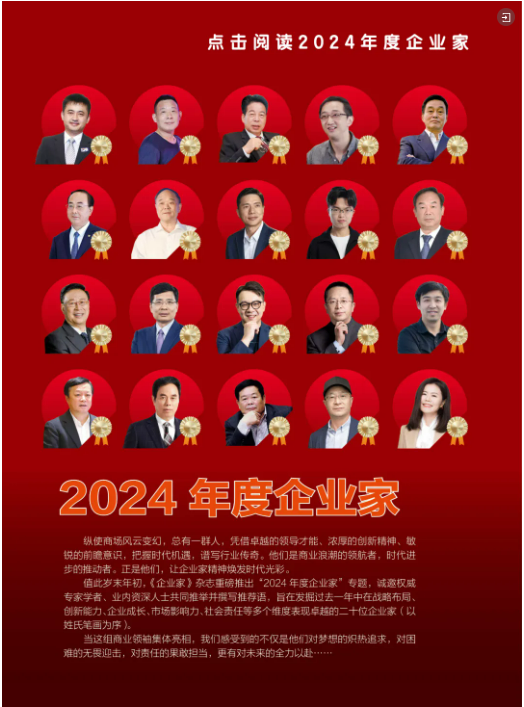 好事成雙!2025年伊始,雙童創始人樓仲平不僅與李彥宏、周鴻祎、曹德旺等20位商界領袖一同被評為“2024年度企業家”,更是憑借自己曲折傳奇的創業故事和“創新、冒險、擔當”的企業家精神,當選為《企業家》雜志封面人物,成為首位登上該刊物封面的中小企業創始人。