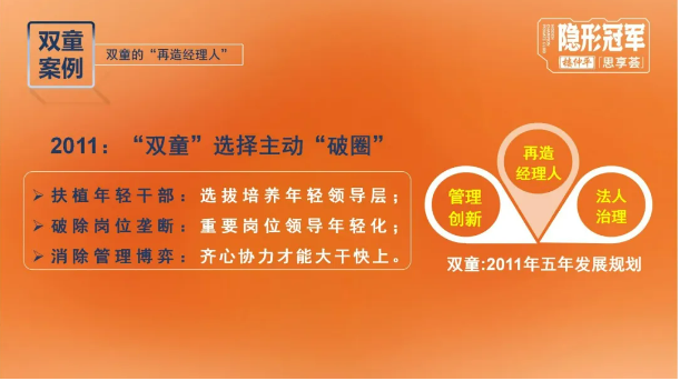 為了解決代際沖突,2011年,“雙童”開始選擇主動破圈,再造經(jīng)理人,把空間讓給年輕人。重新組建的“雙童”行政團隊在當時平均年齡不到30歲,核心團隊的大部分都是90后,新生代員工已成為“雙童”的核心管理骨干。借由2011年的五年發(fā)展規(guī)劃,“雙童”實現(xiàn)了現(xiàn)代化企業(yè)資源配置變革,解決了作為傳統(tǒng)企業(yè)的“老、大、難”問題。
