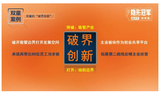 在吸管產(chǎn)品保持相對穩(wěn)定水平但很難取得新突破的情況下,經(jīng)過深度的思考、分析后“雙童”逐漸做出戰(zhàn)略調(diào)整,突破原有“只做一根吸管”的思維禁錮,打開組織邊界,通過不斷嘗試摸索,獨創(chuàng)了一套適合中小企業(yè)的裂變增長的創(chuàng)新模式:將主業(yè)板塊作為創(chuàng)業(yè)共享平臺,拓展“第二曲線”反哺主業(yè)經(jīng)營。