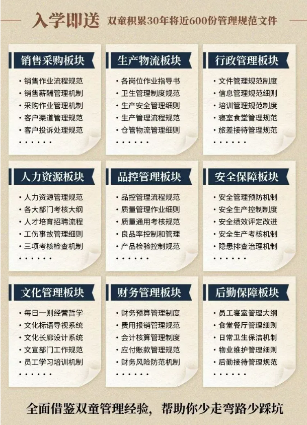 所以,入學“隱形冠軍樓仲平思享薈”之后,項目組會將“雙童”積累了31年、包含了銷售、生產(chǎn)、行政、人力資源、品控、安全、文化管理、財務(wù)和后勤等9大板塊,近600份管理規(guī)范文件,全部打包給學員,幫助學員企業(yè)能夠全面借鑒雙童管理經(jīng)驗、少走彎路、少踩坑!