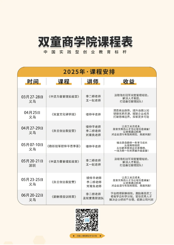 當然,除了現(xiàn)場課堂,還有創(chuàng)始人樓仲平老師的主題課程分享,更有分享結(jié)束后,還將以問答互動的形式為學(xué)員們解答參觀過程中疑惑、或者企業(yè)發(fā)展中遇到的問題,讓大家在研學(xué)活動中避免走馬觀花,真正找到“雙童”經(jīng)營過程中的科學(xué)管理邏輯,實現(xiàn)創(chuàng)業(yè)思維的升階!