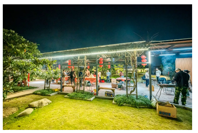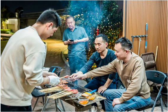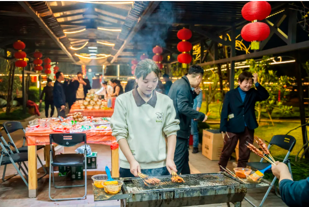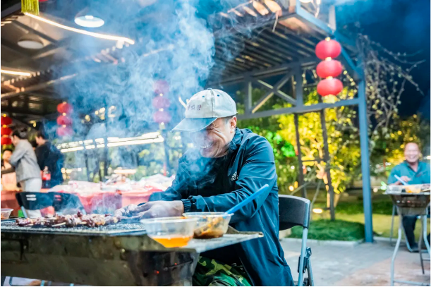接下來,就輪到我們的燒烤師傅登場了!隨著肉串在火焰上漸漸變得金黃誘人,空氣中彌漫著令人垂涎的烤肉香。熊熊燃燒的火焰與大家高漲的熱情讓現場氣氛熱烈非凡,整個空中生態園都沉浸在這份歡樂和溫暖之中。