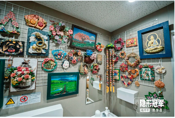 此外,車間內沒有絲毫多余的雜物,工序之間通過透明簾子分隔成獨立空間,而貨架上的物品則用窗簾遮擋,整體環境顯得整齊干凈、井然有序,體現了小而精致的美學理念。