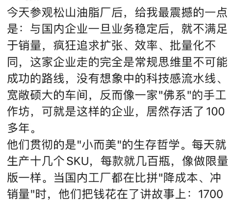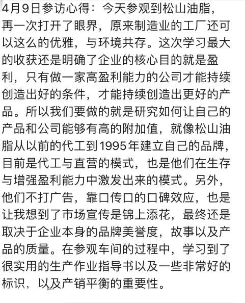 這次參觀松山油脂的富士山工廠,也讓同學們深刻體會到了松山油脂對產品制造的嚴謹態度,同時更加深入了解日本傳統日化制造業的發展和現代管理,學習如何在堅守傳統的同時,實現品牌化與市場化發展。