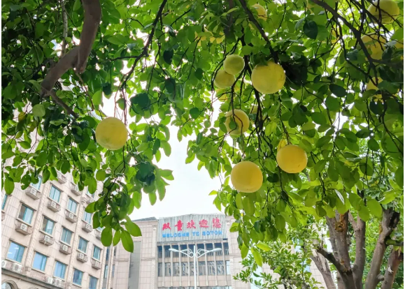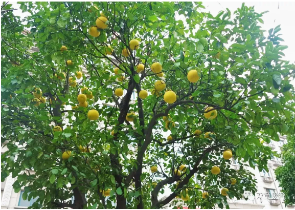 雙童廠區的柚樹大體可以分為兩種:一種是觀賞性的,在老廠區大概有40多棵!等柚子花開落了之后,就會結出一個個果子,又小又青,到了五六月份,就長成了個頭較大的青黃柚子,可以一直掛在樹上供人觀賞,直到次年四月分!