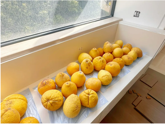 除此之外,柚子皮能夠天然地釋放的芳香物質(如檸檬烯),可以掩蓋甲醛的刺激性氣味,所以雙童二樓樣品間一裝修好,它們就被派上了“大用場”,工作人員裝了幾袋墜落的柚子上來,擺在通風處,只需要一晚上的揮發,整個樣品間就變得清新自然起來,比空氣清新劑還好聞~