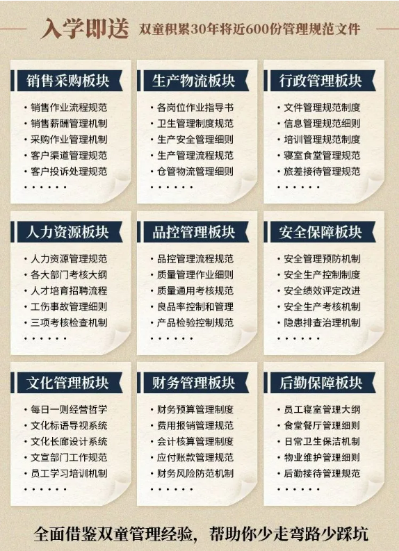 所以,入學(xué)“隱形冠軍樓仲平思享薈”之后,項(xiàng)目組會(huì)將“雙童”積累了31年、包含了銷售、生產(chǎn)、行政、人力資源、品質(zhì)、安全、文化管理、財(cái)務(wù)和后勤等9大板塊,近600份管理規(guī)范文件,全部打包給學(xué)員,幫助學(xué)員企業(yè)能夠全面借鑒雙童管理經(jīng)驗(yàn)、少走彎路、少踩坑!